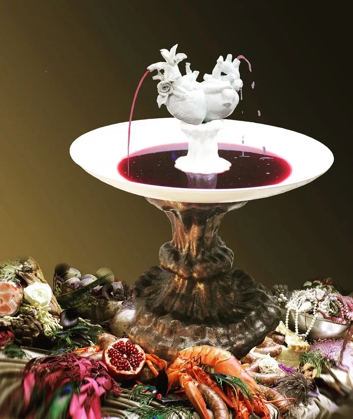 Q:我看你用陶瓷做过一场盛宴,血一样的红酒从喷泉中流出。那件作品就看着挺精致,同时又很盛大。创作那件作品是什么样的契机跟想法?