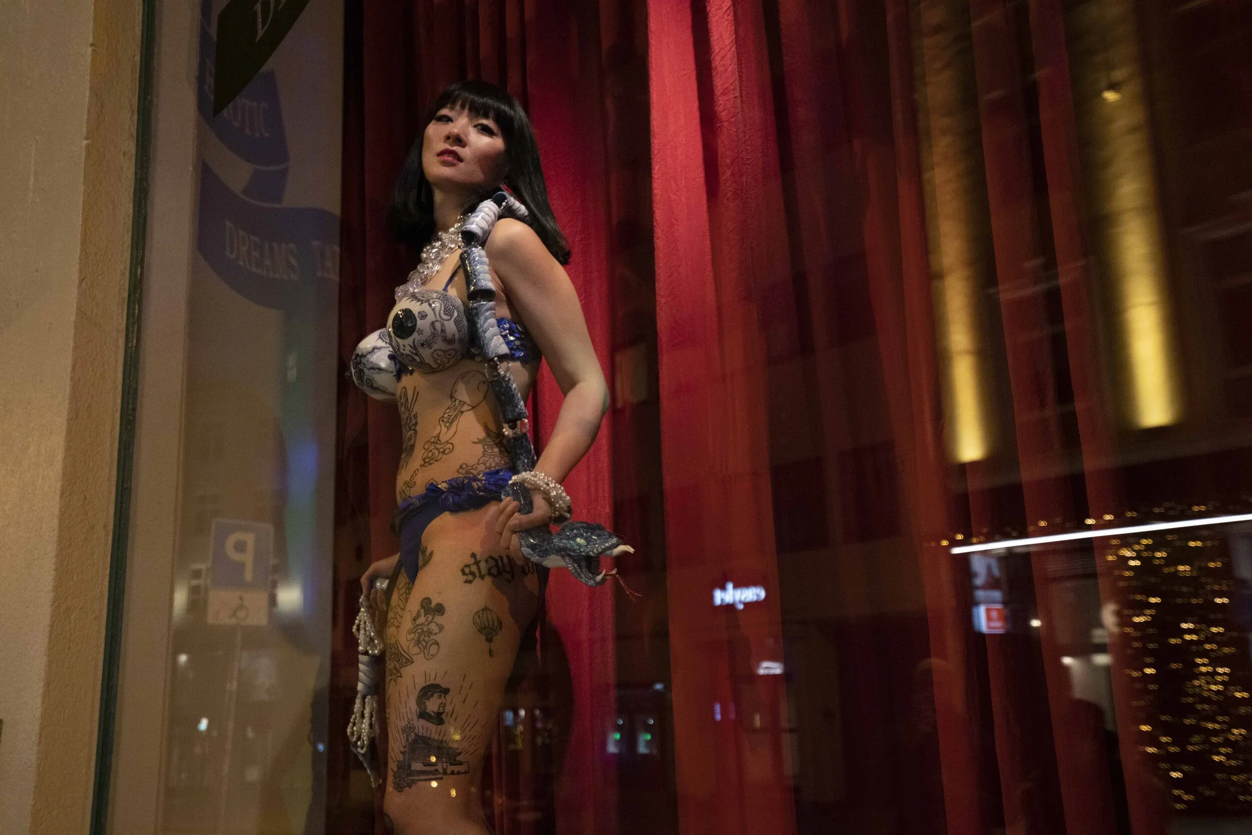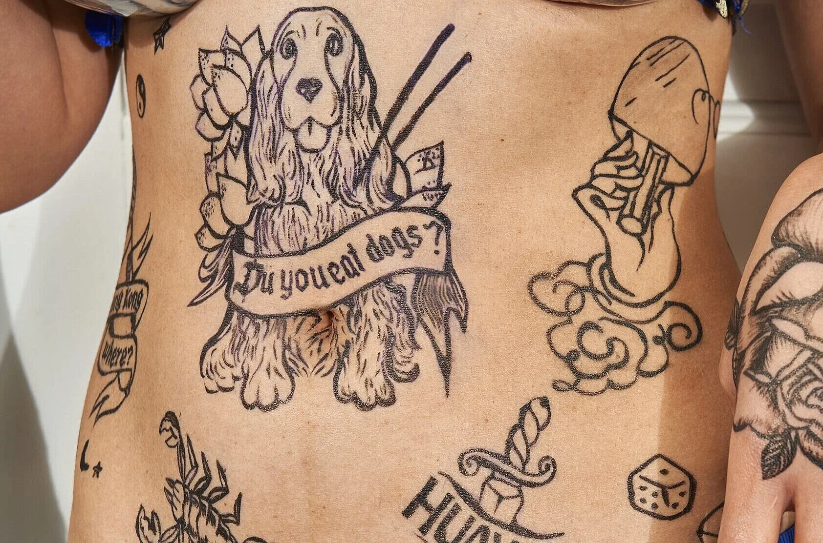 Q: Your work "Poster Girl" seemingly caters to Western imagination of exotic Oriental female images, but the tattoo content on your body makes me feel like you're actually using your body as a mirror, reflecting their projections back to them. It's not the traditional image of a weak figure being gazed upon and projected onto, but rather like a "femme fatale"— a seductive woman who's about to devour them, with a sense of controlling power.